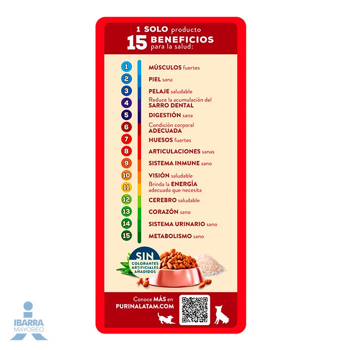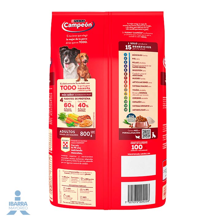 Purina® Campeón® Perros Adultos Todos los Tamaños con Carne, Pollo, Cereales, Vegetales, y Leche, hecho para perros de todos los tamaños. Cuidadosamente formulado con todo lo que tu perro necesita, y nada de lo que no. Sin colorantes artificiales añadidos, con 5 fuentes de proteína, 15 beneficios para la salud de tu perro, además de un sabor irresistible que le va a encantar.
